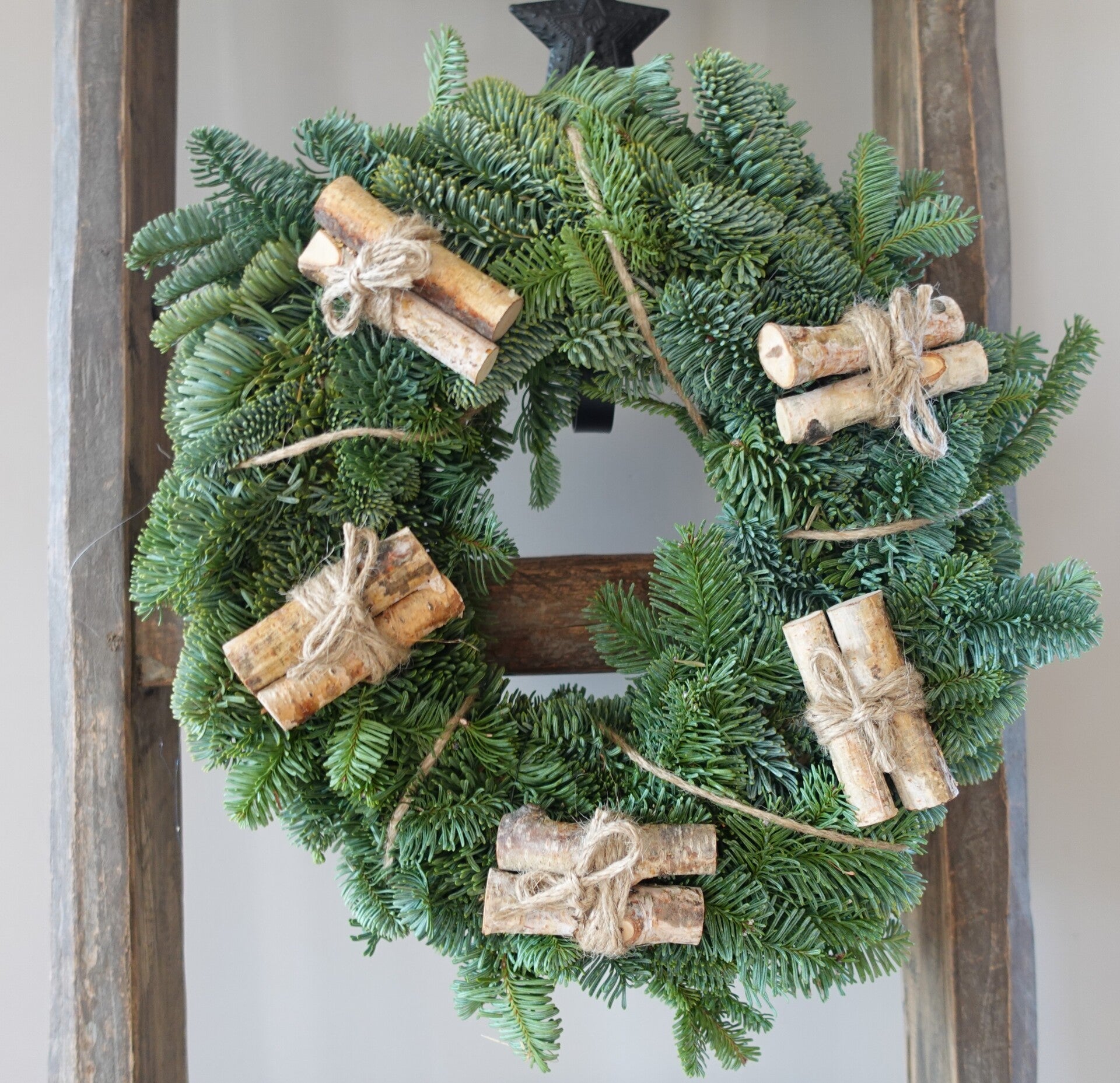 Kerstkrans van nobilistakken opgemaakt met boomstammetjes en takjes. Leuk voor aan de deur!